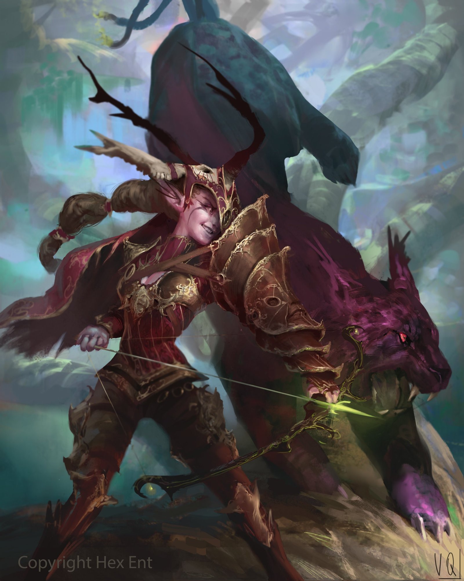 The jungle breathed in shades of sea-glass and rot when she knelt upon the strangleroot and opened her palm. The script she traced did not lie flat—it writhed, a living scrawl that drank from her and from the waiting maw beside her. Antlers crowned her helm, thorns of hammered gold; at her hip a bow hummed with a witch-light string. The panther-shadow at her flank blinked embers, and together they signed the only treaty the wild will honor: hunger bound to purpose, hunter bound to cost.