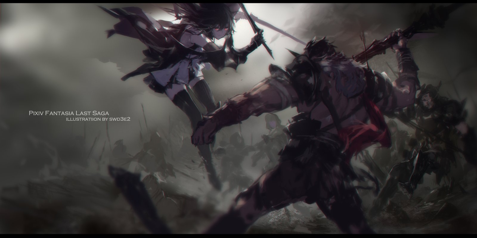 Now, beneath a sky the color of old bronze, two figures meet where the horizon narrows to a single breath. Their swords collide and sing—a shower of sparks wreathed around sigils that remember the oni’s tongue. One bears a winged pauldron and the discipline of a sky-temple; the other, wind-tossed hair and a hunter’s tenacity. They were taught different prayers for the same blade, and each believes the oath belongs to them.