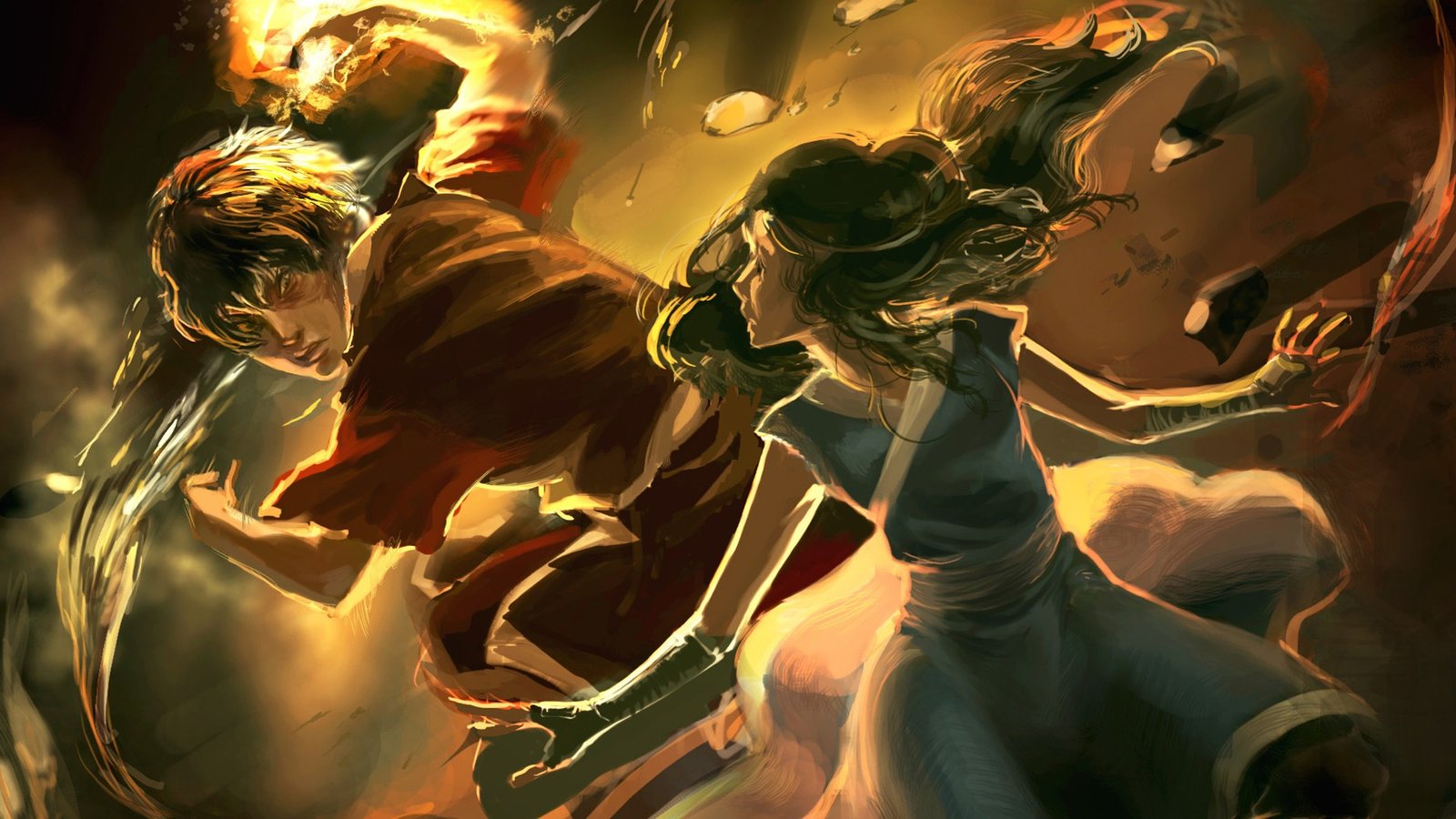 The city hums like a wounded motherboard, its avenues soldered by dusk and rain. In the alleys where data leaks into steam, two figures carve their code into the night—one with knuckles wreathed in solder-bright flame, the other braiding ribbons of water that remember every touch. Their motions are a syntax older than wires: a looping script of heat and tide, a dance that keeps the darkness from compiling.