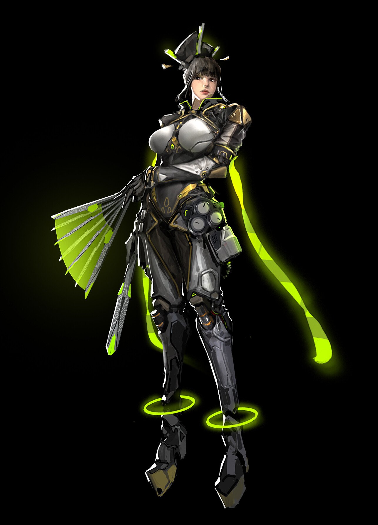 I have walked to the edge of the second hand, where silence pools like oil and the stars seem to hold their breath. There, the shrine waits—a lattice of ages folded into a single breath, its gates breathing a pale, verdant light. She stands before it like a vow made steel: lacquered plates traced with circuitry, a ribbon of green fire drifting from her helm, and a fan of bladed leaves that whisper when they open. Priestess and machine, relic and rumor, she is the only thing that moves when the world forgets to.