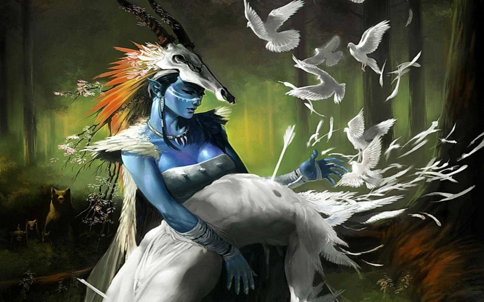 The forest held its breath as the bride of antlers stepped into the green light. Blue as riverstone and crowned in bone, she carried the white stag across the moss like an offering cupped in both hands. From its velvet flank rose a storm of doves, each bird a vow set free, each feather a word the trees remembered. Wolves watched from the shadowed pews, and blossoms leaned closer, curious witnesses to a ceremony older than language.