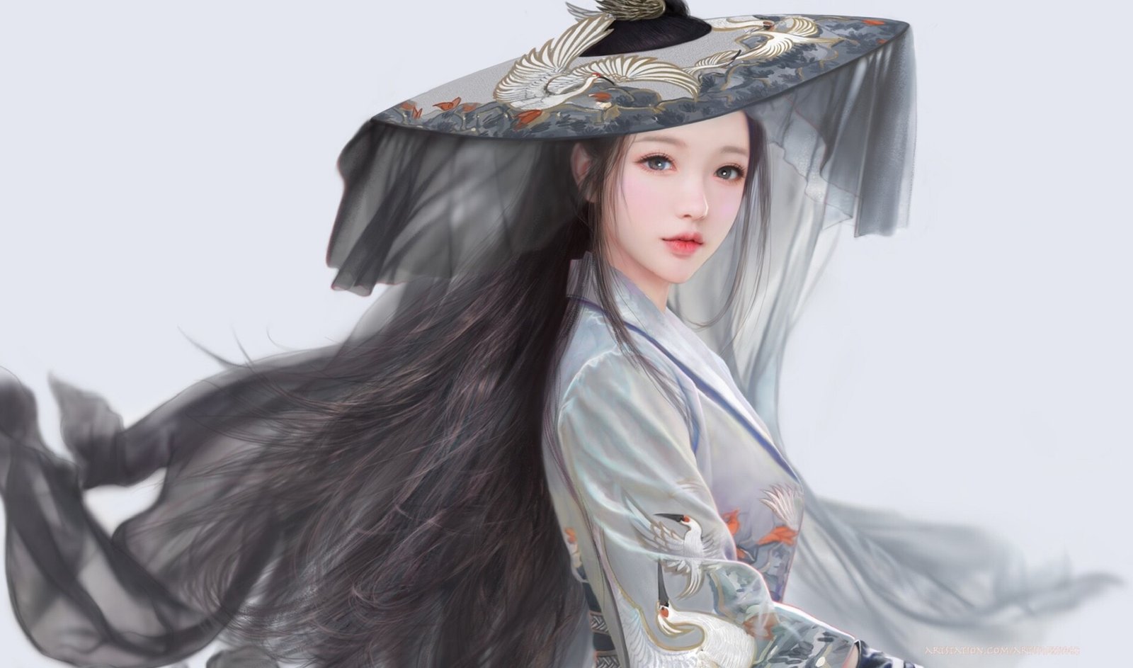 Wind braided through her midnight hair as the veil on her hat whispered like stormcloud silk. Cranes stitched in moon-thread glided across her sleeves, their wings frozen mid-flight, as though they knew the sky would change before dawn. In the mirror-smooth silence beneath the palace eaves, she stood as both omen and invitation—an elegant cipher the court had learned to fear, the girl from the Lotus Court grown into a woman who carried secrets the way other nobles carried blades.