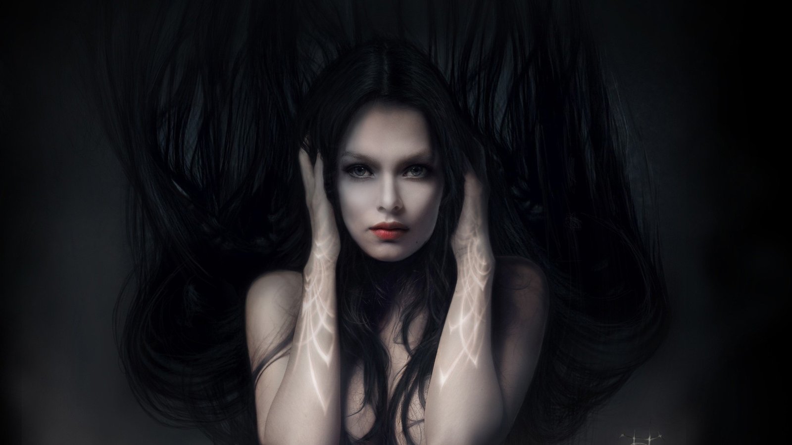 Her hair moved like night remembering the wind, a spill of black ink that refused the lamp’s small mercy. Pale sigils shimmered beneath her skin, webbed constellations mapping scars the world could not name. She pressed her hands to the sides of her head as though cradling a storm, and her mouth—red as a vow—did not tremble. I had come seeking an answer I had no right to demand, and found instead a question wearing a human face.