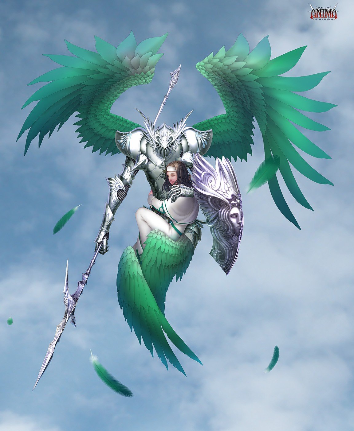 The sky once stood straight as a sword; now it arches like a tired back, a blue cathedral bent by centuries of prayer. Through that bowed firmament glides a winged sentinel, his silver plates feathered with emerald, his spear planted in the wind as if the air were earth. Each beat of his pinions loosens a green thought that drifts down and disappears, and the world below learns to speak in whispers so as not to startle the falling.