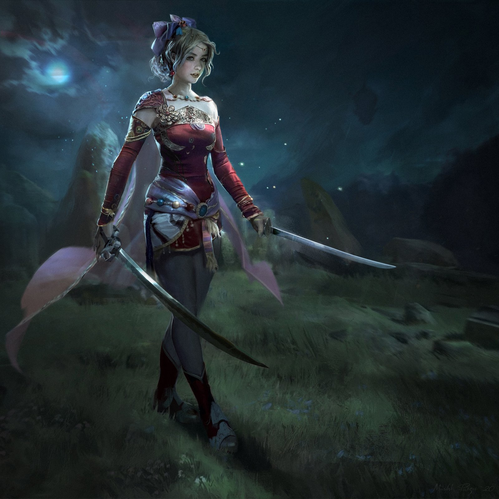 The night gathered like a tide around the standing stones, and the moon wore a bruise-blue halo as if it, too, had been struck by the wind. She stepped into the field with ribbons whispering at her hips and twin blades low at her sides, each curve tasting the damp breath of the grass. Fireflies threaded constellations at her ankles; distant rocks hung in the sky like teeth, patient and watchful. Where she walked, the hush bent inward, as though the world were listening for a name it had not spoken in years.