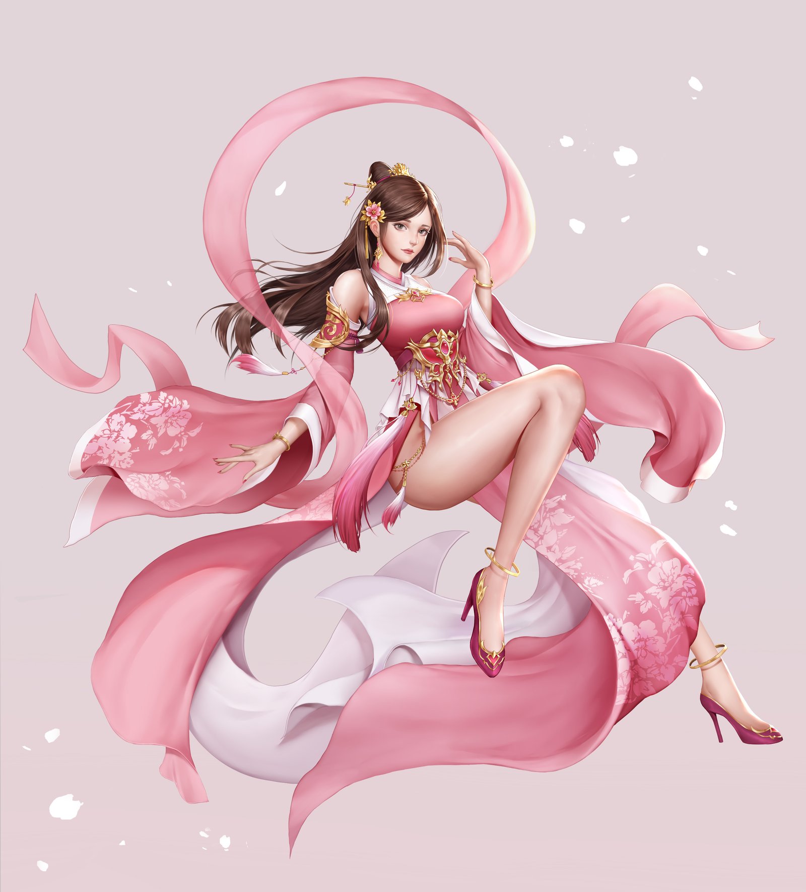 She drifted where the blue of morning forgets its edges, a figure stitched from cloudlight and blossom, her silk a tide of dawn and dusk. In her hand, a parasol the color of shy petals kept court with the wind, scattering small constellations of cherry bloom that gleamed like promises. The sky had a name for her that the earth had only whispered: First lady—first among the Celestial Household, first to step between decree and desire, first to wear the seasons as a mantle and make them obey.