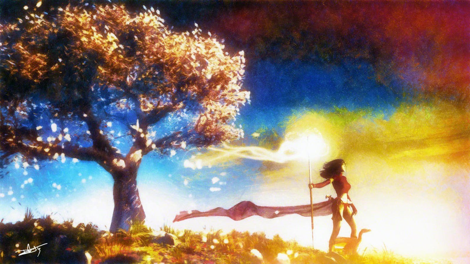 At the hinge of night and morning, the sky split into cobalt and molten gold. On the hill the old tree held a thousand quiet fires in its leaves, scattering sparks across the grass as the wind hurried past. She climbed to it with a ribbon of cloth streaming behind her and a staff in her hand that cradled a captive dawn; even the shadows seemed to step aside.