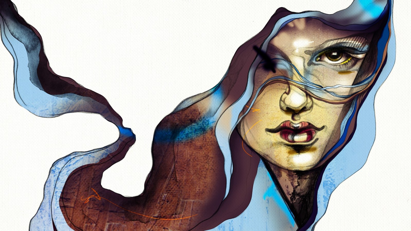The city teaches its lessons in silence, in the spaces between a blink and a breath. I learned them by tracing the currents that ran across her veiled face—blue waterlines and smoke-dark ribbons that curled like clauses no one dared to speak aloud. One eye watched the alleys where truth went to ground, the other hid behind lacquered shadows; her lips held the final syllable of a warning I was never meant to hear.
