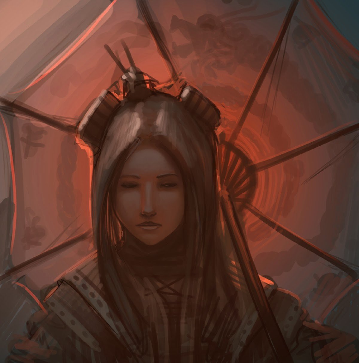 At the hour when roofs were ink and lanterns were small, patient moons, a girl stood beneath a paper parasol and let the world turn around the spokes. The silk burned with a hidden dawn, a red bloom trapped just behind her, as if the sun had been convinced to wait. Wind threaded her hair like quiet handwriting, and the street gave back only the hush of her sandals, careful as promises.