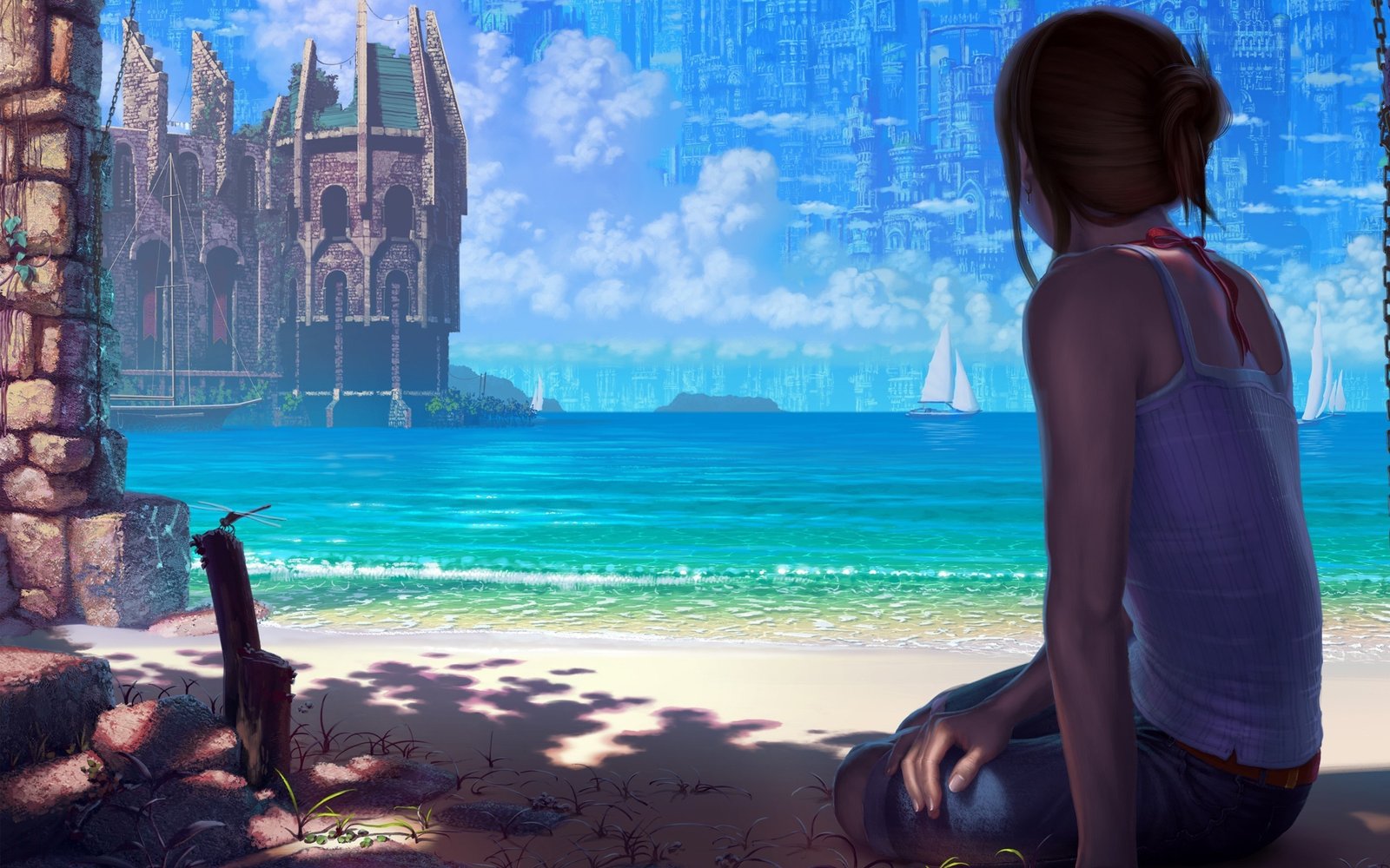 The sea wore the color of secrets—layered blues, soft as breath, bright as warning. She sat beneath a crumbling arch where chains remembered storms, watching the ruined cloister that stood on stilts across the water, its windows dark and patient. White sails stitched slow commas into the horizon, while above the clouds a second city hung like a watermark, an architecture of whispers pressed into the sky. Even the dragonfly on the old post seemed to hold its place as if the air itself were a page that must not rustle.
