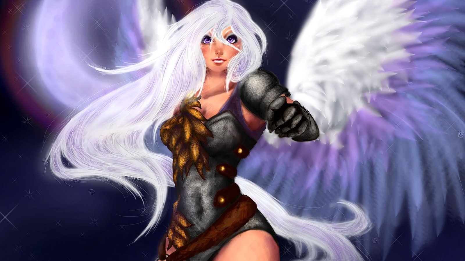Beneath a lilac moon rimmed in frostlight, she stepped from the hush between constellations. Her hair streamed like a slow comet, her wings fanned from white into violet dusk, and the night bent around her as if remembering an old song. Armor stitched with autumn gold caught the starlight—tokens of vows older than the first shoreline. The world below—oceans dreaming, forests murmuring—waited, unsure whether to hold its breath or sing.
