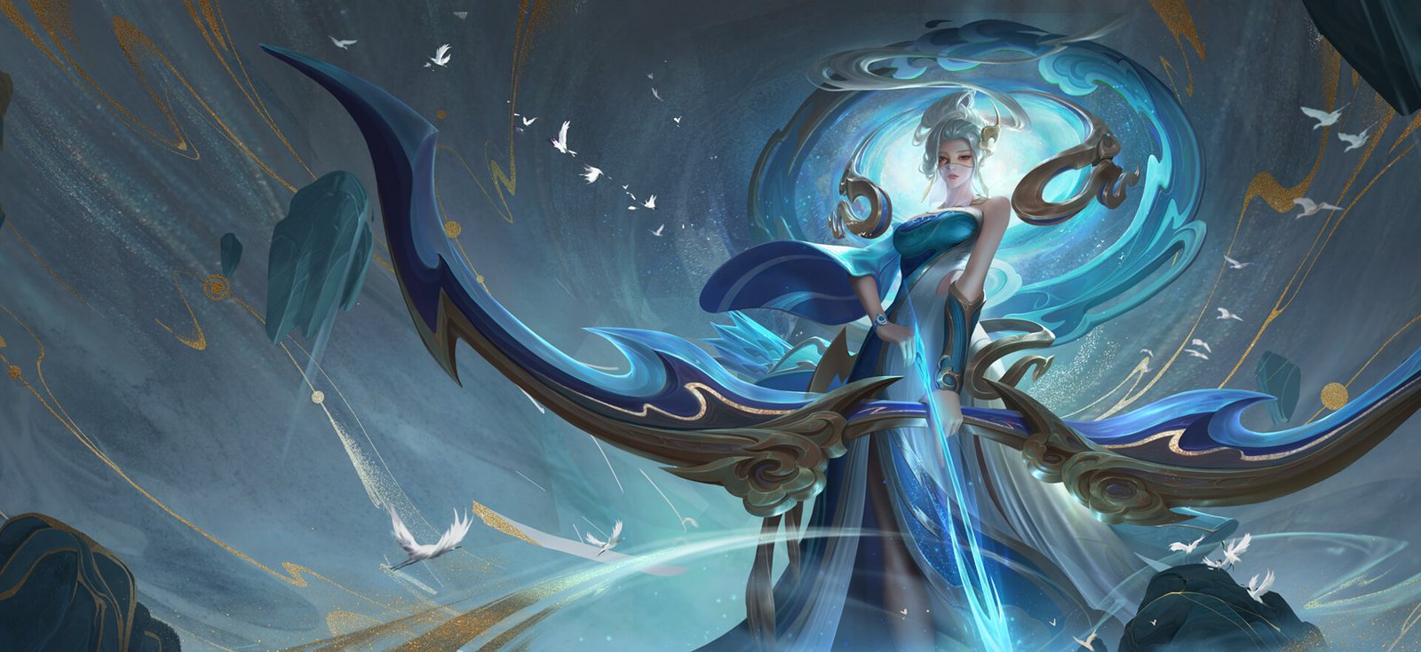 On a night washed in indigo, beneath a crescent that shaved a blade of light from the clouds, she stood at the brink where wind met void. Braids threaded with cold glimmer lifted as if the heavens were breathing her name, and ribbons—red as a remembered dawn—streamed from her sleeves. The moon etched her into a rumor the dark had tried to forget.