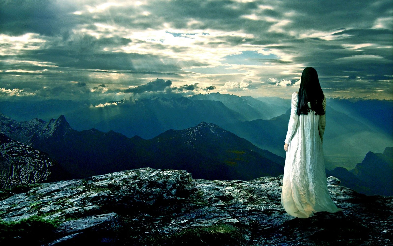 The sky unstitched itself above the high country, letting down pale ribbons of light that curved like a silver sickle over the darkened ranges. She stood at the cliff’s lip in a dress the color of undisturbed snow, the wind combing her hair while the mountains breathed in blue. Between storm and sun there opened a quiet, a thin bright arc resting on the world—fragile, steady, impossibly calm.